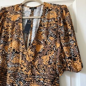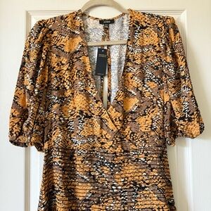New with tags AFRM mini dress puff sleeve with elastic closure, gold,brown and white color, is perfect for a wedding guest or a night out. Featuring a flattering fit and flare silhouette,deep neckline. The ruffled tiered design adds a touch of elegance, making it a standout piece for any cocktail occasion. Excellent condition new with tags.