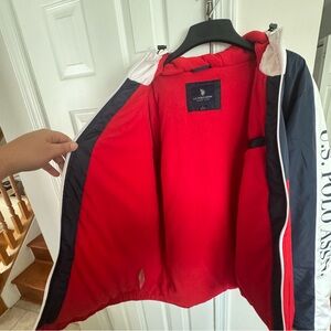Preowned worned few times. U.S. Polo Assn. (USPA) men's classic polar fleece jacket in size large. This cozy navy blue jacket offers a timeless pullover style with a comfortable, warm polar fleece fabric perfect for layering during cooler weather. Features include a ribbed crew neck, long sleeves, and a straight hem for easy wear. Ideal for casual outings or everyday comfort. From a smoke-free pet-free home.