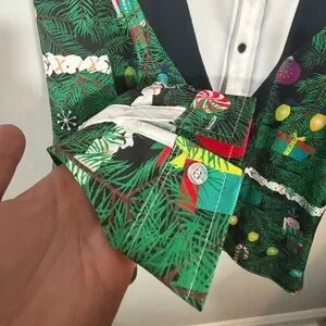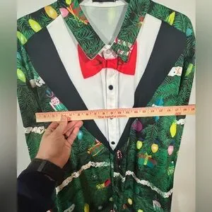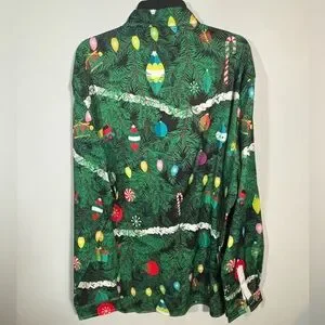 Make a statement this holiday season with this fun Atlantl Christmas tuxedo-print button-down shirt. Features a festive evergreen, ornaments, and novelty holiday design with a printed tuxedo front—perfect for ugly sweater parties, Christmas gatherings, or themed events.