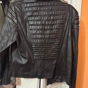 Edgy black leather jacket with zipper details. Ideal for a bold look.