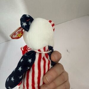 Charming Ty stuffed animals. Red and white monkey with heart bow. Bear with stars and stripes pattern. Great for kids and collectors.