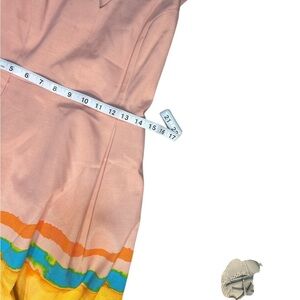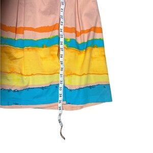 Vibrant and feminine! Tracy Reese x Anthropologie sleeveless pink fit & flare dress featuring a watercolor stripe hem in orange, yellow, and turquoise. Hidden back zipper, v-neckline, and fully lined for structure and comfort.