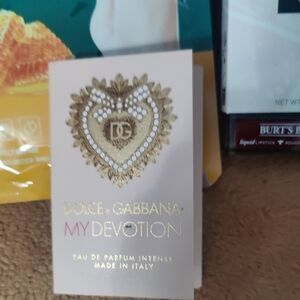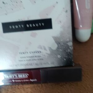 Blue and white Clinique bag. Includes honey foot mask, Burt's bees lip gloss, Clinique facial products and beauty items. Decorative charm attached.One shell necklace with earrings