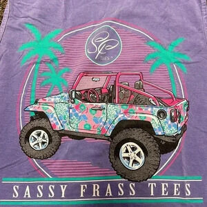 Great condition Sassy Frass Tees brand tee. Women’s size large. 32” long. 24.5 “pit to pit. Loose fit. Made by Confort Colors. Muscle style tank top. 100% cotton. Lavender purple color. Vintage garment wash. Sassy Frass front printed graphic. Tropical pink Jeep print graphic back. Preppy style. Great for every day, lounge, beach, pool, or gym. Feel free to leave a comment or bundle! Thanks for browsing!