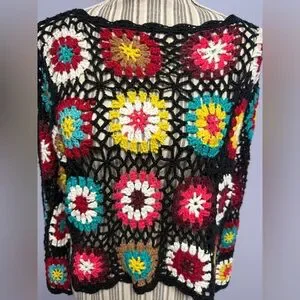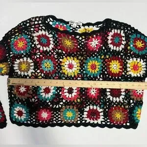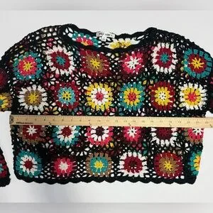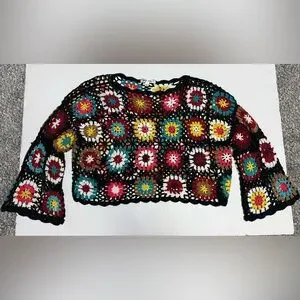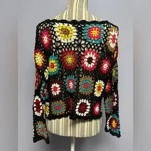 Stylish crochet knit sweater with vibrant circular patterns. Ideal for a chic layered look. Wild Honey crochet multicolor granny square oversized, bell sleeve, cropped size S. In like new condition.