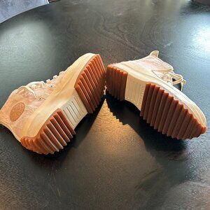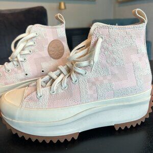Stylish high-top sneakers. Features pink canvas with white accents. Durable rubber sole.