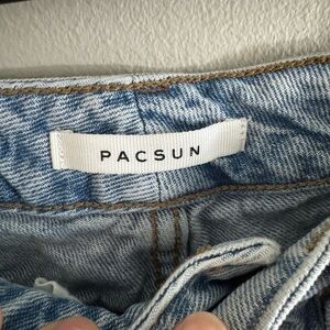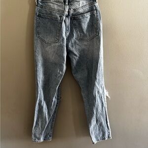 Trendy light blue mom jeans with distressed details. Casual and stylish fit.