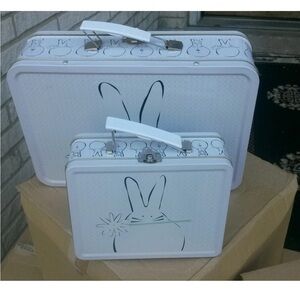 2pc White Bunny Print Metal Lunch Boxes rabbits design 1large 1small must see NW