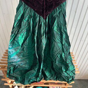 Vintage Emerald Green & Burgundy Velvet Puff Sleeve Dress Bow Detail Crinkle