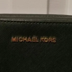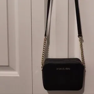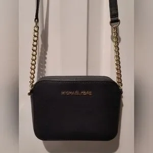 Elegant black crossbody bag. Features gold chain strap. Michael Kors logo on front.