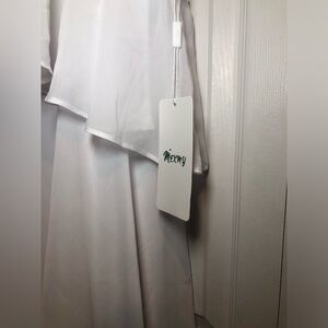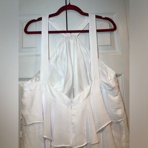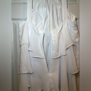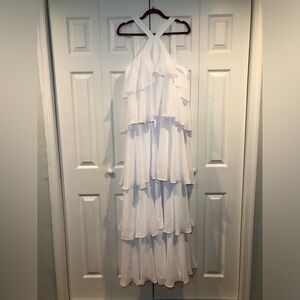Chic white dress with halter neckline. Features elegant layered ruffles. Perfect for weddings. Flowy and Soft Chiffon, Polyester 100%, Full lining.