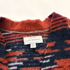 Rich in color and texture, this Lucky Brand Aztec duster is a statement layering piece for cooler seasons. Designed with a bold Southwestern-inspired knit, it features a vibrant mix of purple, orange, burgundy, brown, and tan for a warm, eye-catching look.