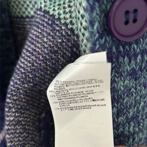Stylish cardigan with bold geometric design. Features green, pink, and blue accents. Ideal for a modern look.