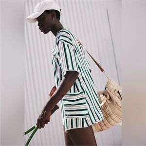 Stylish striped romper. Features green and white pattern. Comfortable and chic design.