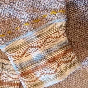 Cozy beige sweater with colorful striped details on the back. Perfect for casual wear. Textured front light weight sweater in the back. Raw edges give it a unique look. EUC no snags or loose threads that aren't supposed to be there.