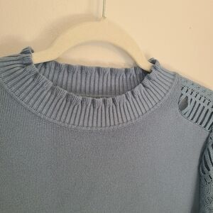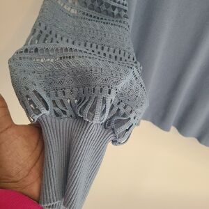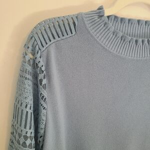 Elegant blue sweater with intricate lace sleeves. Perfect for a stylish look. Women's light blue mockneck sweater by Siani Milano, size XL. Fabric blend of rayon, polyester and nylon. Excellent pre-owned condition overall; small snag in the left shoulder (see pic 6).