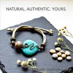 The focal of this bracelet is a huge, turquoise colored, Howlite Heart + a brown Jasper Bead that I wire wrapped with bronze jewelry wire. Bronze corrugated beads secure the faux suede cords and the "closure" bronze bead is embossed with a swirl design.
