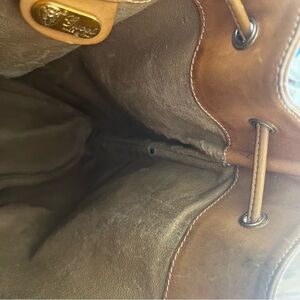 Condition: good, some wear on the leather and corners. Gold hardware has some wear. Strap has some wear and area near top of strap has been fixed on one side.