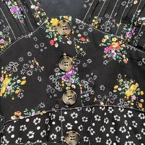 Free People Wonderland Mini Dress. Contrasting floral prints highlight a boho-chic minidress styled with tortoise buttons that run down the front and adjustable ties that cinch the waist.