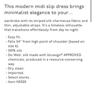 Stylish silk midi slip dress in neutral stripes. Ideal for special occasions. 100% silk. Retail $248