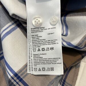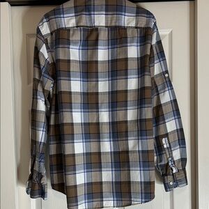 Stylish Timberland men's plaid shirt featuring a classic blue and brown design. Shirt features button upfront, double chest pockets, and button cuffs. Sleeves can be rolled up and secured with button as seen in pictures. Great pre-owned condition, 100% cotton. Measurements laid flat: