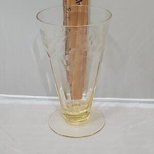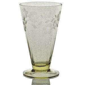 This Tiffin Floral Etched Footed Ice Tea Tumbler is a beautiful piece of Mandarin Yellow Depression Glass. Perfect for collectors or as a unique addition to your glassware collection, it offers vintage charm and elegance.