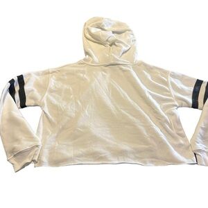 This unique cotton-poly blend sweatshirt features a cropped hemline and accented sleeves giving it a sporty but easygoing style. The ribbed cuffs provide stay-put comfort while lounging or working up a sweat. Fits true to size. 52% Cotton / 48% Polyester. This sweatshirt is super soft NWOT size small never worn. White with dark gray stripes on sleeves.