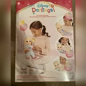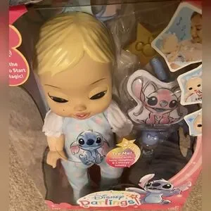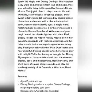 Spark the Magic with Disney Darlings – The Happiest Baby Dolls on Earth! Born from love and magic, meet your adorable baby doll inspired by Disney’s Stitch. This joyful 13-inch baby comes to life with twinkling, starry cheeks, infectious giggles, and a sweet lullaby. Each doll is inspired by classic Disney characters and come with a character-inspired outfit, open/close sparkly eyes, a magic wand, matching baby accessories, a birth certificate and a character-themed headband. With a wave of your magic wand, her cheeks light up with stars. Peek closely to spot the hidden Mickey Mouse icon in her eyes! She responds with realistic, charming, and fun baby sounds that encourage imaginative nurturing play. Feed your baby with the “Pixie Dust” bottle and hear cheerful drinking sounds while her cheeks glow with delight. Tickle her tummy or snuggle her Disney plush character friend and hear the sweetest giggles, coos, and magical sound. Rock her softly and she’ll doze off, make sleepy sounds, and play the soothing melody of “A Dream is a Wish Your Heart Makes.”