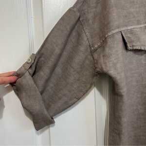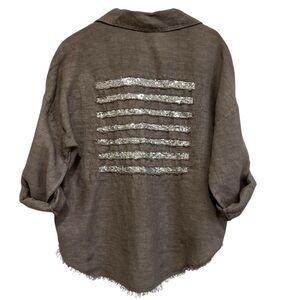 Puro Lino Brown Linen Button Down Shirt Silver Sequin Stripes Roll Tab OS