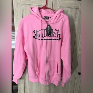 Chic zip-up hoodie in bubblegum pink. Features iconic Von Dutch branding. Perfect for casual wear.