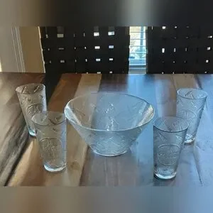 Rare Vintage Coca Cola Etched Glass Popcorn Punch Bowl Antique Collectible, four glasses included.