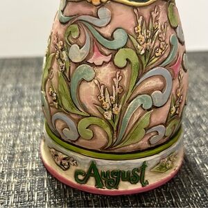 This 2008 angel figurine is by Jim Shore. It futures floral intricate design, green gemstone, and it says August. The flowers are gladiolus and the gemstone is peridot, which you see written on the figurine.