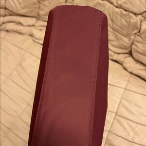 Elegant burgundy crossbody bag. Features gold accents. Adjustable strap for comfort.