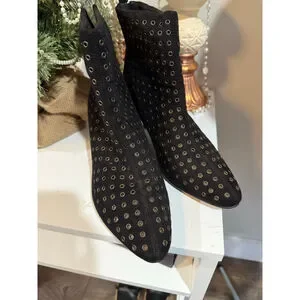 Chico’s Black Suede Eilena Ankle Boots, Grommet Embellishments, 8.5, 2” Heel, Good Condition