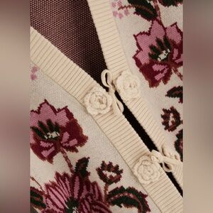 Farm Rio knitted cardigan Floral intarsia, V-neck, pleats at shoulders, puff balloon sleeves, knitted floral appliqués at front, ribbed trims Tie fastenings at front
