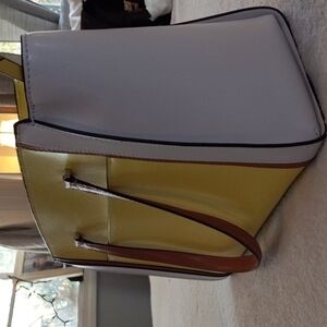 The handbag zips across top and has an open pocket on the back. Inside is very room and features both an open and zippered compartment. There is no shoulder strap with this bag.