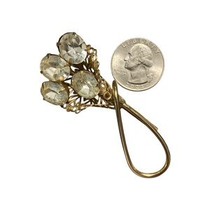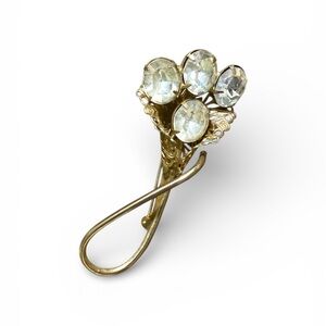 Elegant vintage floral spray brooch featuring four large oval faceted glass rhinestones set in an airy gold-tone filigree basket. The design evokes a classic bouquet form, with fine wirework and a graceful silhouette.