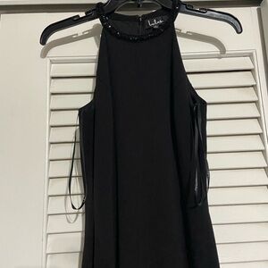 Chic black dress with a stylish beaded neckline. Perfect for elegant occasions. Size Small. Worn only once, like new. Has a black slip underneath the main fabric of the dress. Excellent quality.