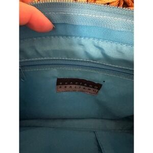 Carry a burst of vibrant summer energy with this Braciano handbag. Its playful pleated ruffle design in a cheerful blue and green plaid pattern evokes sunny days and breezy afternoons. The unique bamboo handles add a touch of natural elegance, while the secure zipper closure keeps your essentials safe. Inside, the bright blue lining offers a pop of color and easy visibility. Perfect for beach outings, casual shopping trips, or adding a charming accent to your everyday look.