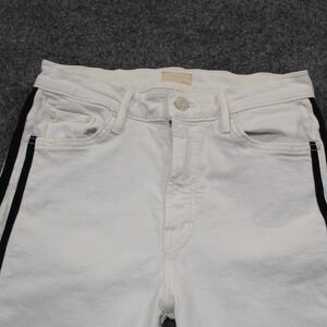 MOTHER Insider Crop Step Fray jeans in white with a black side stripe detail. These cropped jeans feature a raw frayed hem and a slight flare at the ankle. The denim construction offers durability and a classic feel. Side stripe adds a sporty chic element to the design. Five-pocket styling with a button and zip fly closure. The step fray hem provides a modern, deconstructed look.