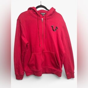 True Religion full-zip hoodie in a bold red color featuring signature logo details and graphic back print. Soft fleece interior with a classic streetwear fit—great for casual, Y2K, and everyday wear.