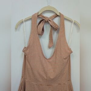 This is a halter fit and flare dress from Pact. Burnt orange brown color with a cream stripe. Has pockets! 95% cotton. Built in shelf bra.