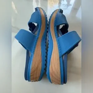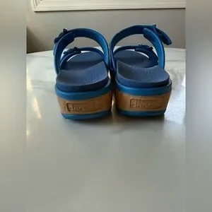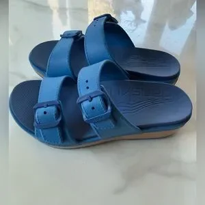 Comfortable blue sandals with dual buckle straps. Perfect for everyday wear.