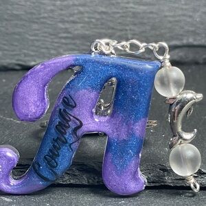 This Hand Crafted purple And Blue resin keychain with 'Courage' inscription features clear quartz crystal dangling charm Accented with silver chain and a silver dolphin.