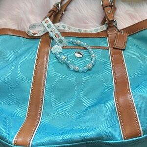Chic Coach shoulder bag in turquoise and tan. Stylish design with elegant accents. Perfect for daily use.