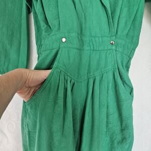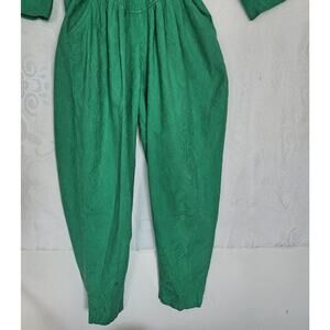 Step back in time with this rad vintage 80s one-piece wrap-style jumpsuit! Featuring a unique textured brocade pattern, this jumpsuit screams retro boldness. The parachute hammer pant design adds a touch of avant-garde flair to your wardrobe. This piece is in excellent pre-owned condition, ready to turn heads and spark conversations.