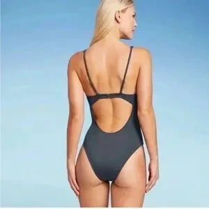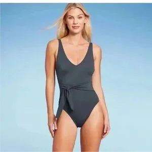 One piece swimsuit in a navy/slate blue color. Features a flattering fit with a tie at the waist and a chic design.