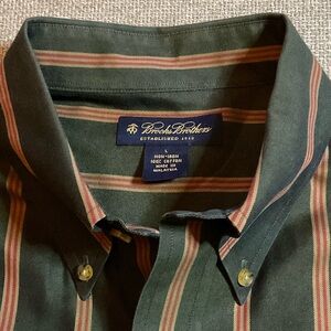 Classic button-down with green and brown stripes. Perfect for casual outings. Timeless style from Brooks Brothers. (DJ)