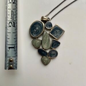 Elegant modernist style pendant necklace. Vintage 80s-90s. Pendant made of a cluster of ovals silver toned ovals coated with enamel in shades of grey. Pendant is 2 in tall, and chain 16 in long (without the extension). Pre-owned, in very good vintage quality.