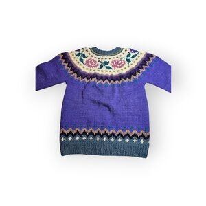 This authentic Sue Dille Designs cardigan is a stunning, artisanal piece that brings warmth and character to any wardrobe. Handcrafted in Ecuador from 100% handspun wool, this heavy-knit sweater features a beautiful purple base with an intricate floral and geometric Fair Isle pattern across the yoke, hem, and cuffs.